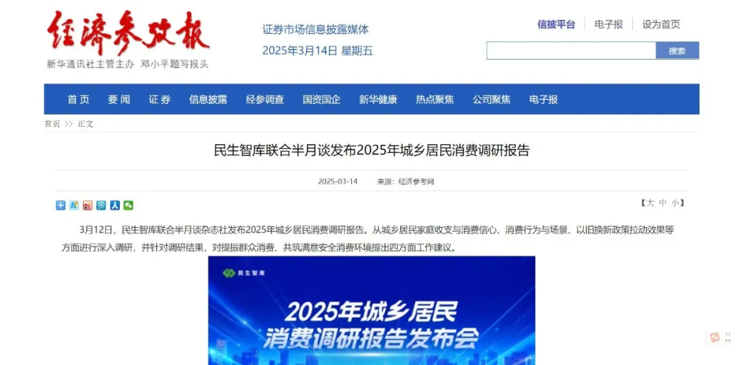 导读:3月12日,民生智库联合半月谈杂志社发布2025年城乡居民消费调研报告。从城乡居民家庭收支与消费信心、消费行为与场景、以旧换新政策拉动效果等方面进行深入调研,并针对调研结果,对提振群众消费、共筑满意安全消费环境提出四方面工作建议。报告已在新华社客户端、半月谈杂志、新华社经济参考报、人民日报中国城市网等媒体同步发布。如需获取报告全文,请联系我们。